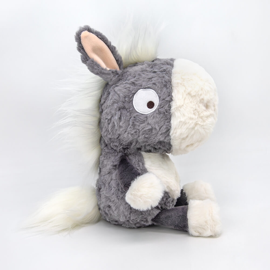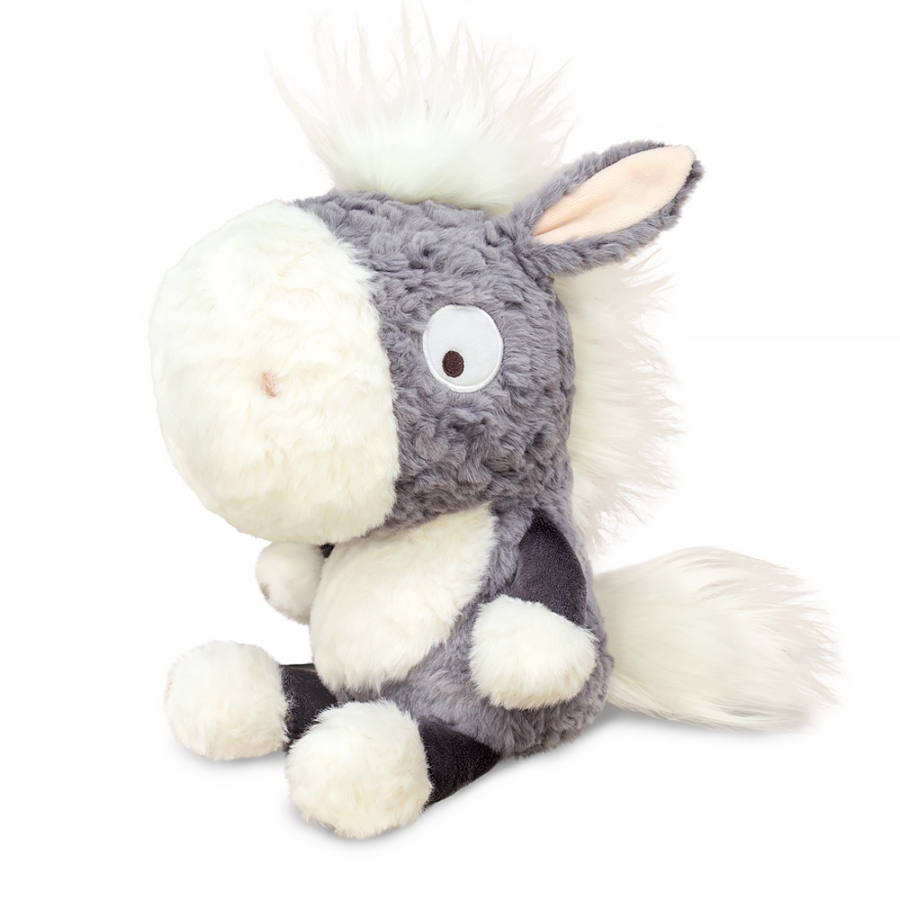 Малыш Эдди сшит из тактильно-приятного меха с небольшим завитком дымчато-серого цвета. Мордочка, грудка и копыта из молочного мягкого меха, а сами ножки из плотно-серого софта. Грива и хвост из длинного прямого меха. В ушки вшит бледно-розовый софт.