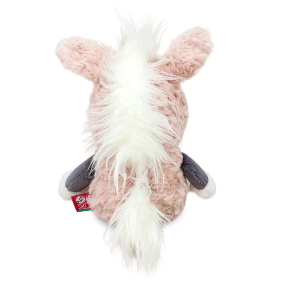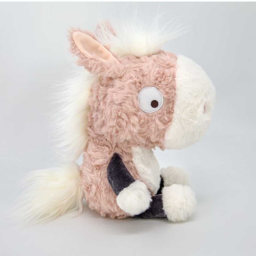 Очень нежная малышка Элинор сшита из тактильно-приятного меха с небольшим завитком жемчужно-розового цвета. Мордочка, грудка и копыта из молочного мягкого меха, а сами ножки из фиолетово-серого софта. Грива и хвост из длинного прямого меха. В ушки вшит бледно розовый софт.