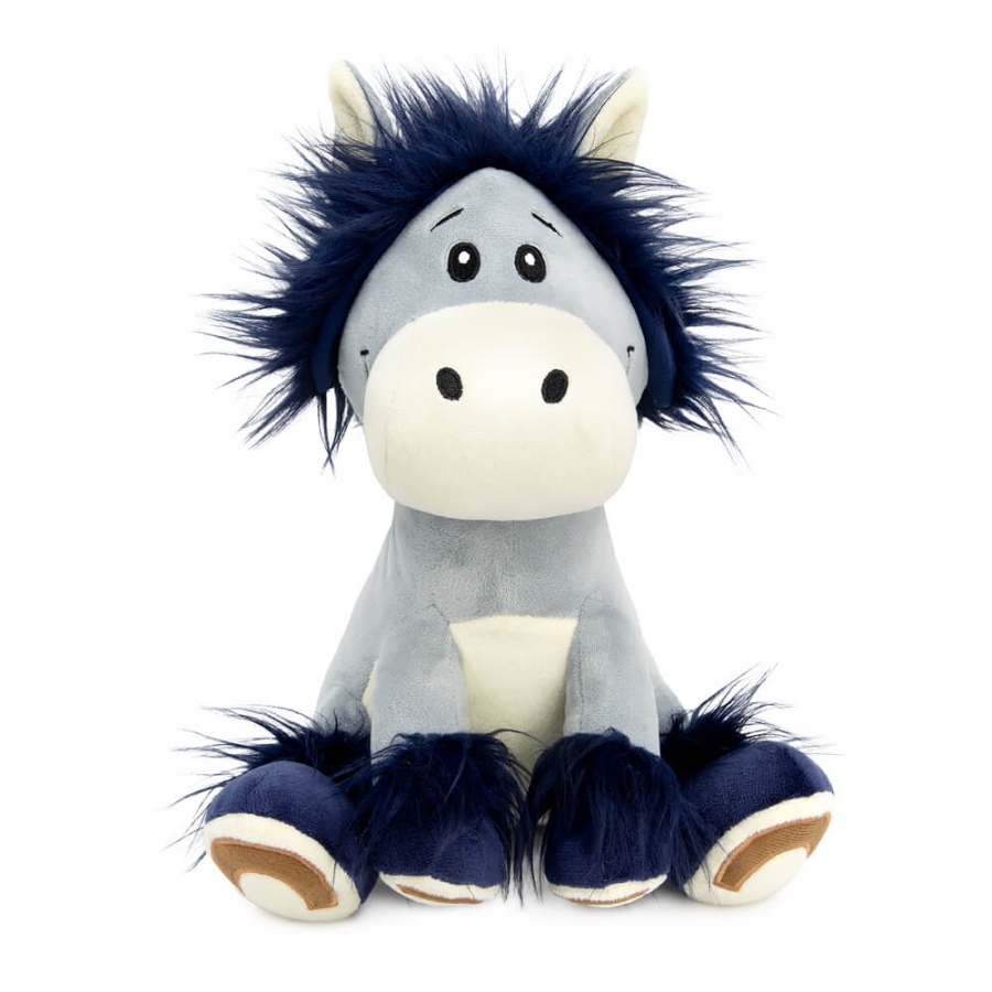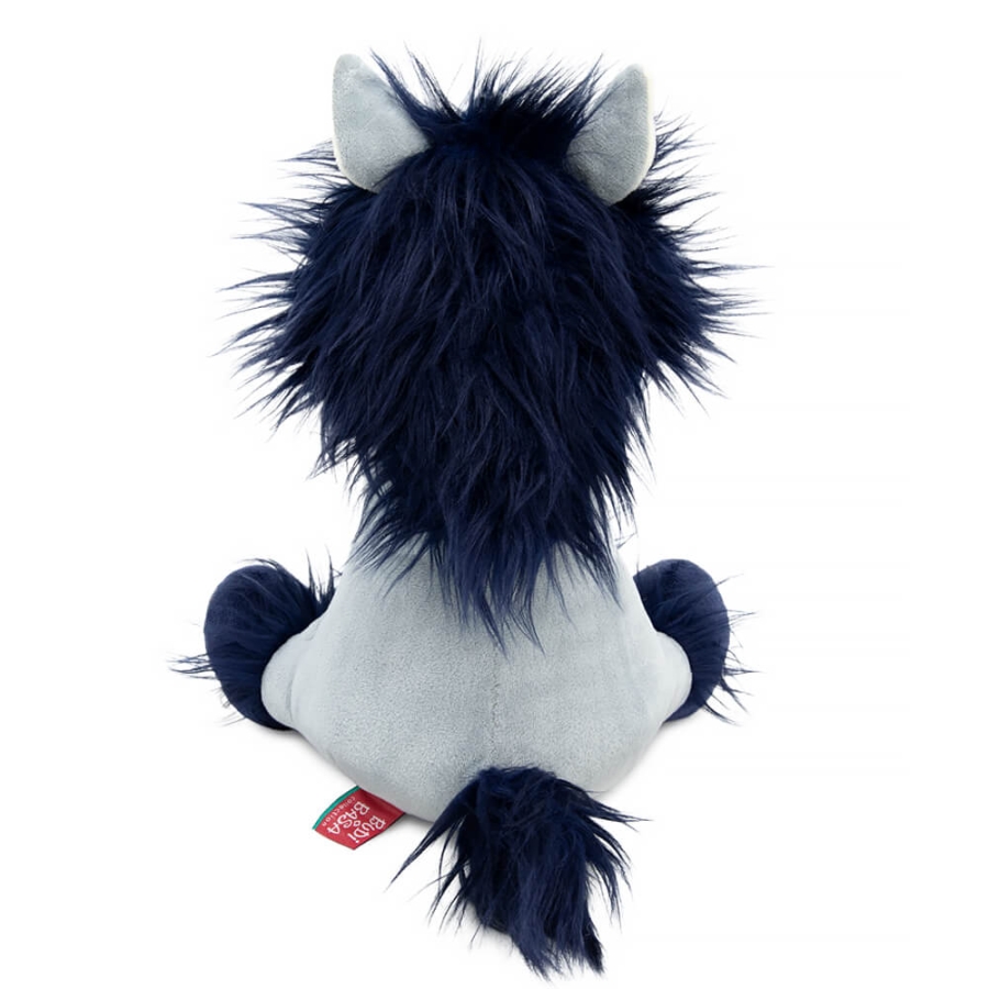 Забавный, небольшого размера конь Флинн сшит из серо-голубого софта с белым животиком и белой мордочкой. Грива, хвост и отделка на ногах из длинного прямого меха сапфирово-синего цвета. Копыта из синего софта с аппликацией в виде подковы.