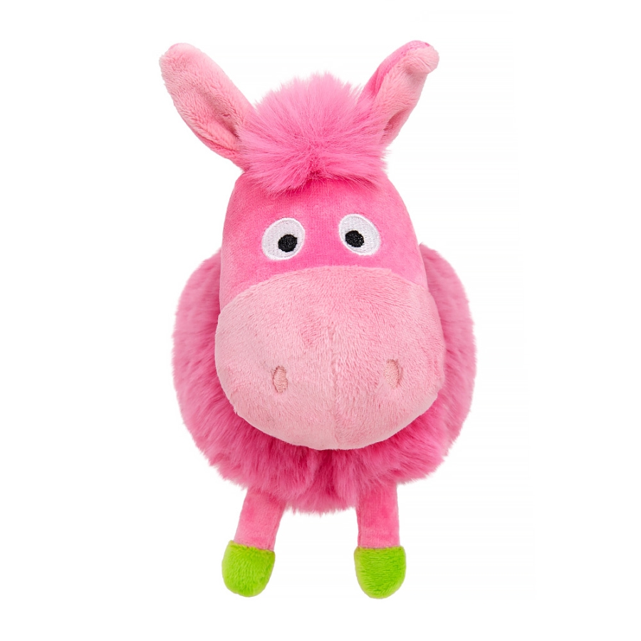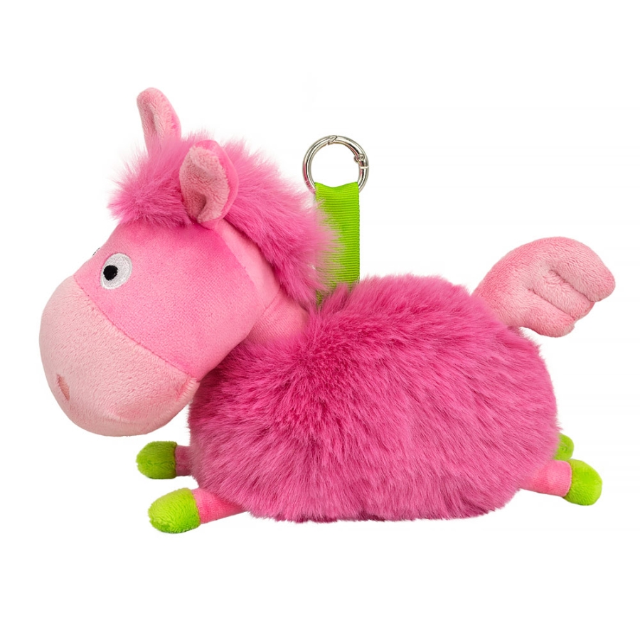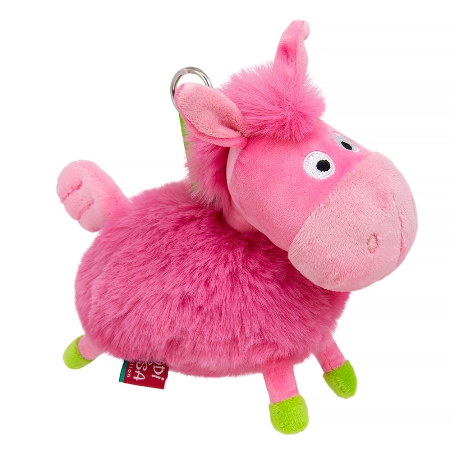 Лошадка-подвес Хлоя сшита из розового меха с вышитыми глазками. Мордочка, ножки, ушки и хвост сшиты из двух оттенков розового софта. Копыта из лаймового софта. Подвес из лаймовой репсовой ленты с серебристым разъёмным кольцом.